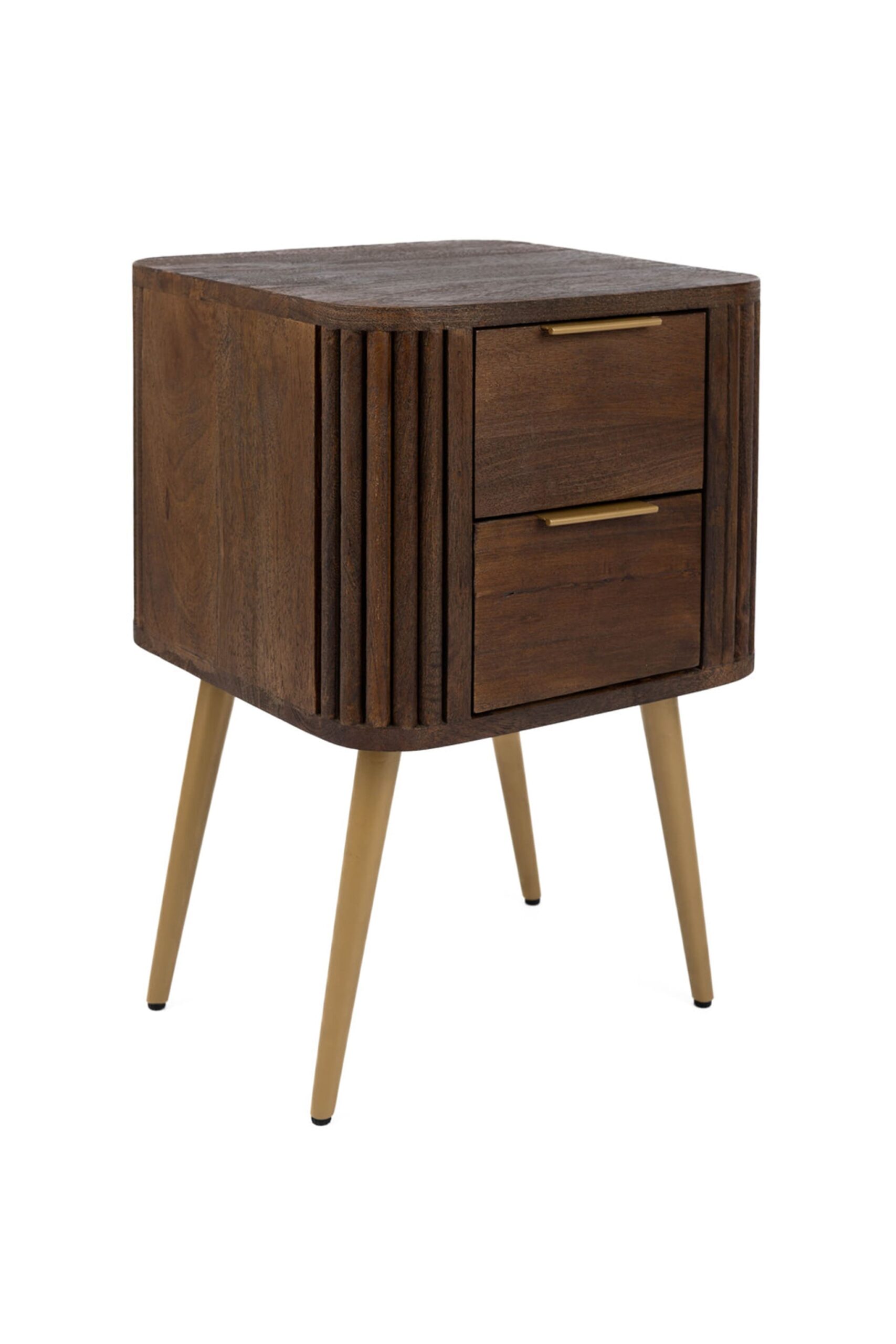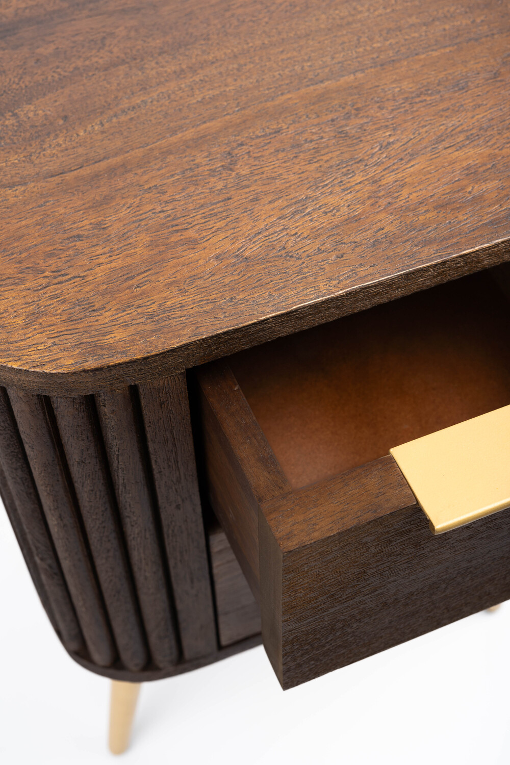 Breng warmte en elegantie in je interieur met nachtkastje JULES. Dit kastje combineert de rijke uitstraling van donker afgewerkt mangohout met een elegante gouden afwerking. De zijkanten zijn afgerond en afgewerkt met latjes, wat het meubel een organische en harmonieuze uitstraling geeft.